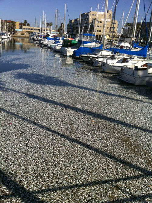 This reports an invasion of “billions of dead fish” at Redondo Beach, California. And they are sardines. There was no red tide, no presently known force to slaughter all these little fishies. They just appeared, floating dead and pallid, amid the fishing vessels and weekenders’ yachts in King Harbor. In my own gleeful defense, I would like to note that the article says they were first mistakenly identified as anchovies; evidently, identifying dead fish usually found in tins is difficult even for the experts.
