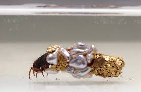 However, any one caddis pupa can be presented with carefully curated building supplies by scientists with slightly more time on their hands than common sense – supplies that include gold and silver beads and wire, tiny glass beads and cabochons, slivers of mirror, polished fragments of jade, sapphire, topaz, ruby, amethyst and lapis lazuli. Fish scales like burnished silver, seed pearls, slices of millefiori glass. and the occasionally nicely polished fragment of amber beer bottle or blue hand cream jar.